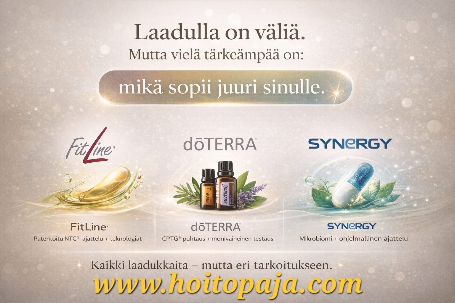 Kun valitsen tuotteita omaan käyttöön tai asiakkaiden tueksi, käytän usein kokonaisuuksia, joissa mukana voi olla esimerkiksi FitLine, doTERRA ja Synergy. Ne ovat kaikki laadukkaita, mutta ne edustavat hieman eri painotuksia.